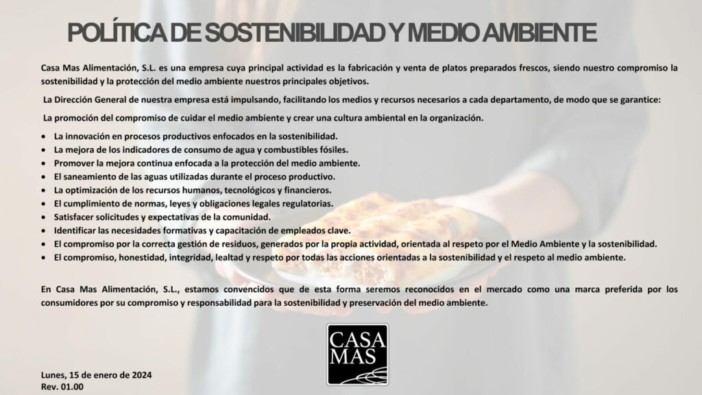Casa Mas Alimentación, S.L. es una empresa cuya principal actividad es la fabricación y venta de platos preparados frescos, siendo nuestro compromiso la sostenibilidad y la protección del medio ambiente nuestros principales objetivos.
